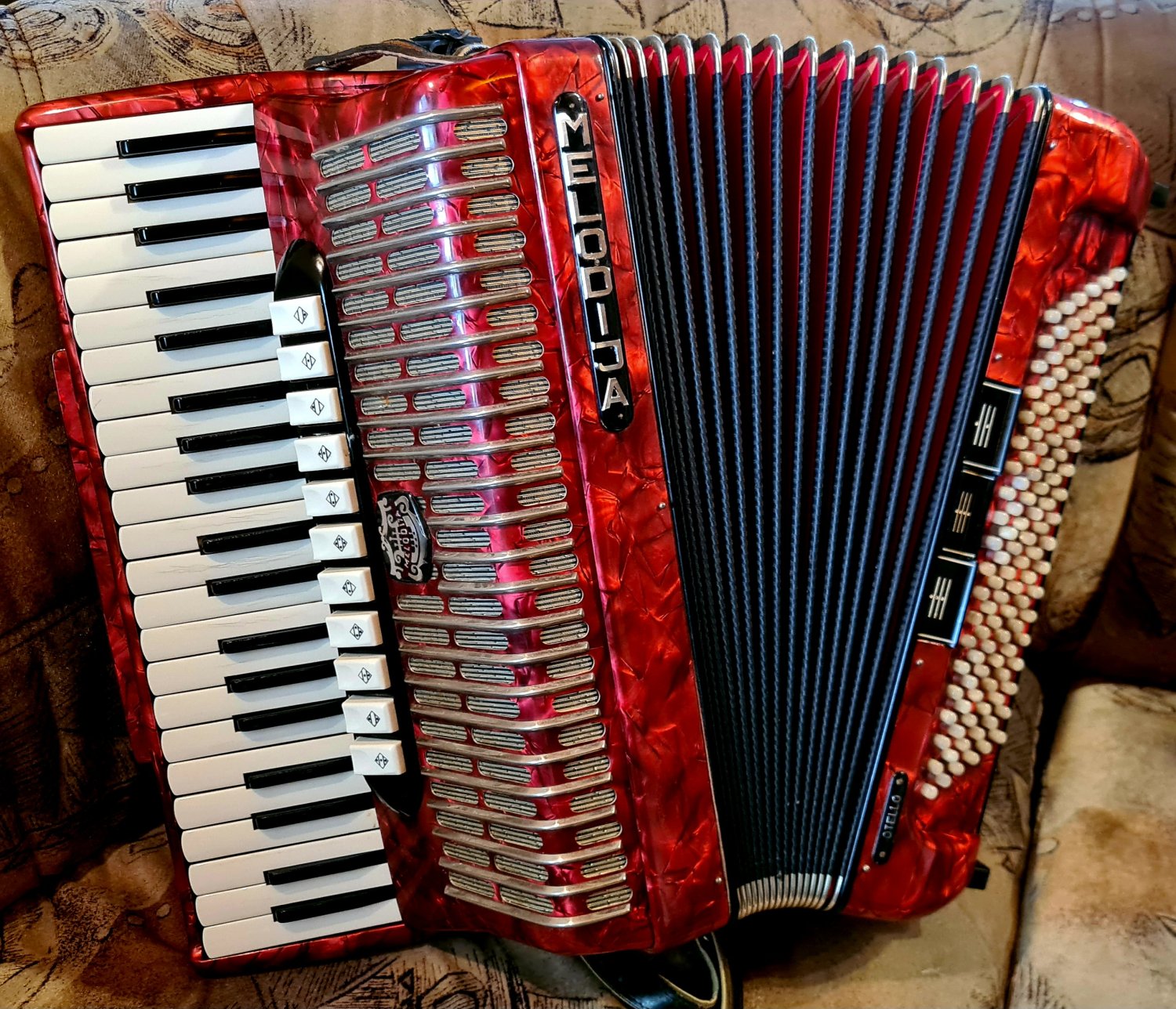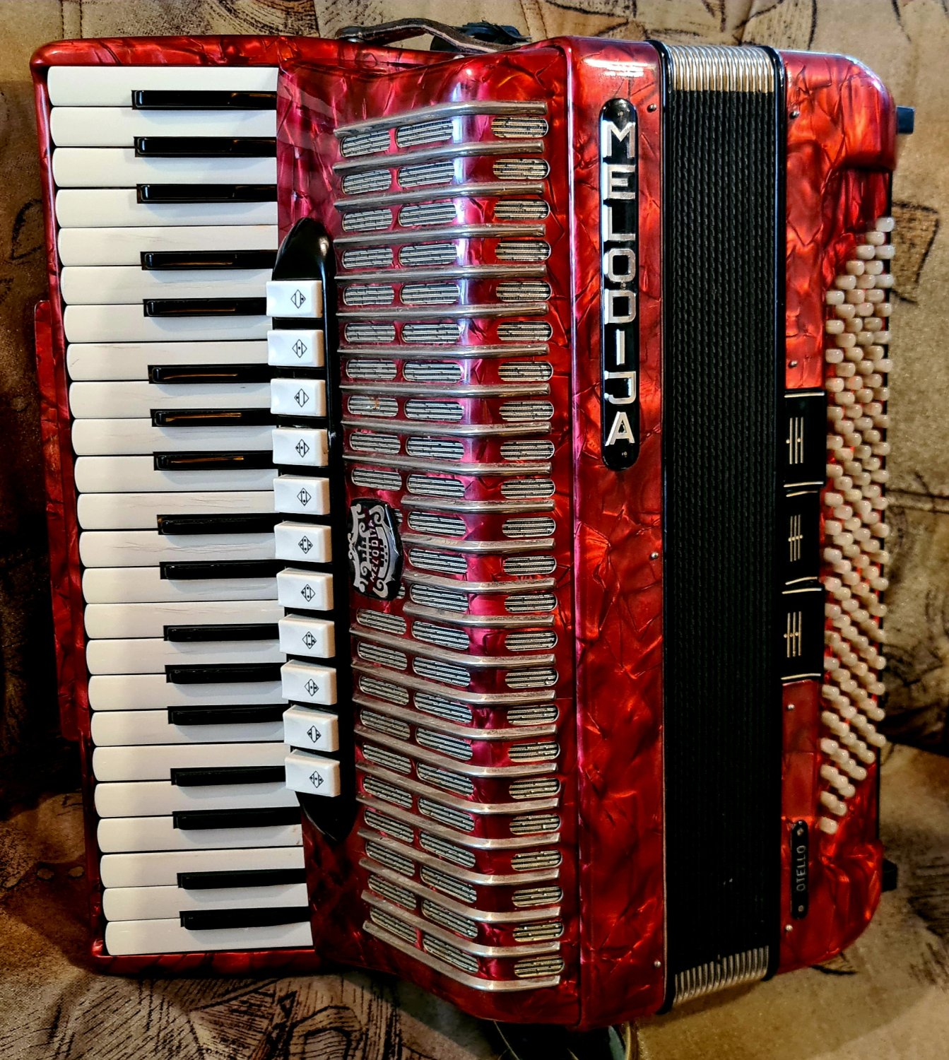 Melodija Otello 41/IV/120 Melodija Otello 41/IV/120 Harmonika ima 41 tipk, je štiriglasna v kombinaciji s piccolom (4-8-8-16) in 120 basna.Ima profesionalne Tipo a mano glasilke.Je servisirana in ima kovček. Cena: 1.000 € Smo pooblaščeni serviser za harmonike Beltuna, Hohner, FBB in Weltmeister.